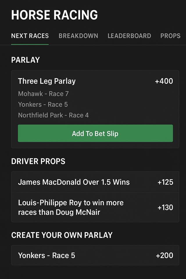 Harness racing is ripe for modernization with betting options that mirror popular sports betting formats. To attract a broader and more engaged audience, we propose implementing fixed odds betting markets that include driver matchups, positional over/unders, totals on top finishers, and parlay options based on saddlecloth numbers. These innovative betting markets will enhance excitement, transparency, and strategic engagement for bettors.